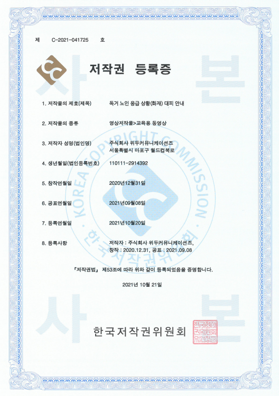 [한국/저작권] 독거 노인 응급 상황(화재) 대피 안내 페이지 정보 작성자 WeDu 댓글 0건 조회 6,537회 작성일 21-12-31 12:41 본문 2021-10-21 저작권 C-2021-041725 영상저작물>교육용 동영상 List Previous[한국/저작권] 장보기 인지훈련 게임 21.12.31 Next[한국/저작권] OLL KIDS/MATH 21.12.31