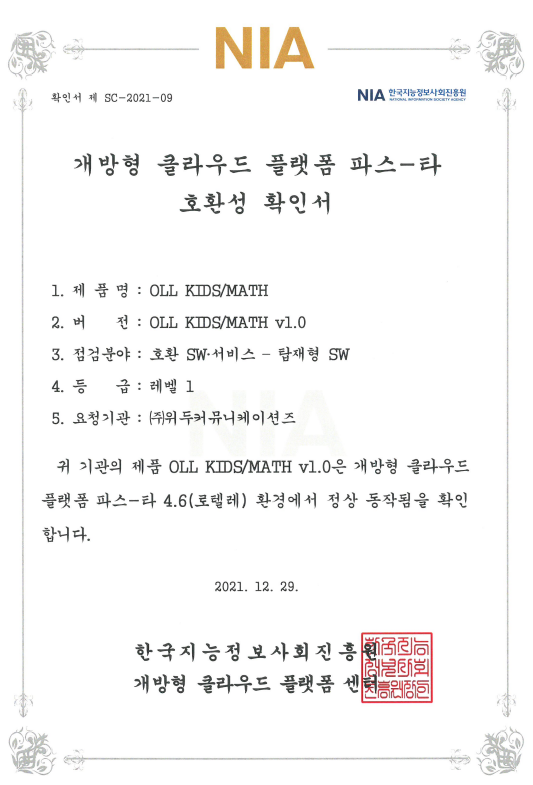 [한국/확인서] OLL KIDS/MATH 파스-타 호환성 확인서 페이지 정보 작성자 WeDu 댓글 0건 조회 10,482회 작성일 21-12-31 12:48 본문 2021-12-29 확인서 제 SC-2021-09 점검분야 : 호환 SW서비스 - 탑재형 SW List Next[한국/인증서] OLL KIDS/MATH 클라우드 서비스 확인서 21.12.31