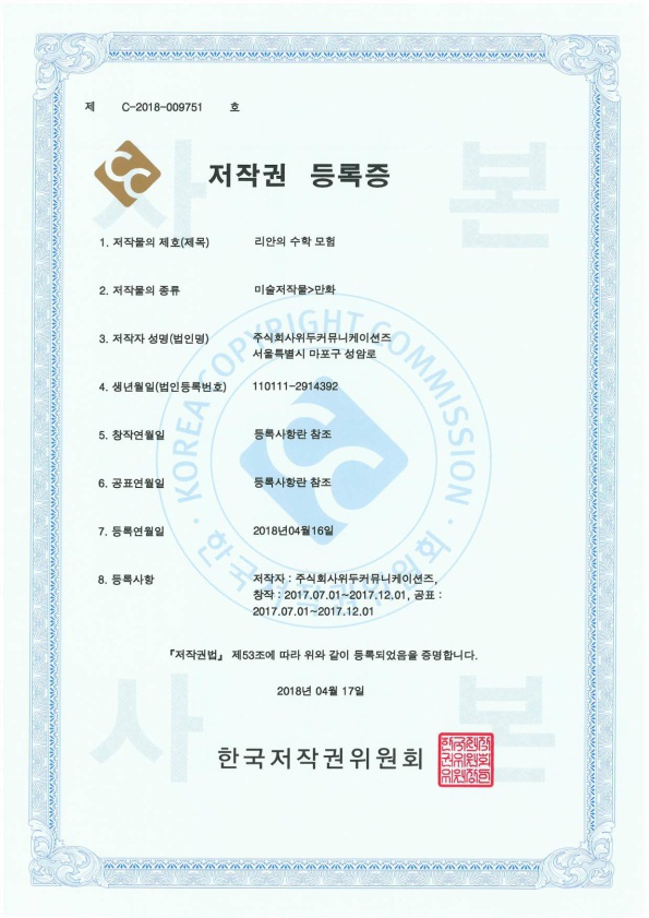 [한국/저작권] 리안의 수학 모험 페이지 정보 작성자 WeDu 댓글 0건 조회 6,113회 작성일 19-05-30 19:07 본문 2018-04-16 저작권 C-2018-009751 리안의 수학 모험 / 미술저작물>만화 List Previous[한국/저작권] 길리 19.05.30 Next[한국/저작권] 신입사원조기전력화 이러닝 콘텐츠 19.05.30